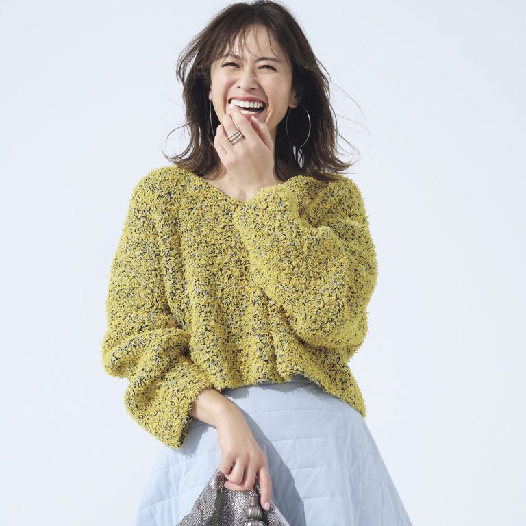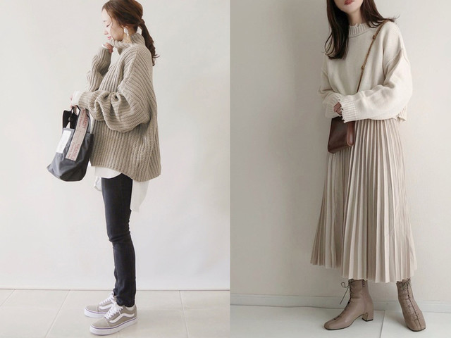 コーデの主役は、春らしいカラーのラベンダーニット。スカートはラベンダーと色合いが似ているので、組み合わせて着ることでワントーンコーデが完成します。