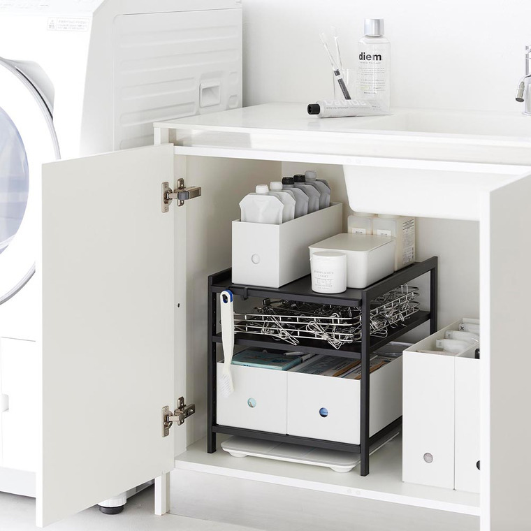 こちらは、靴箱の下のスペースにつっぱり棒2本を渡した例。こうすればスペースを有効活用でき、2段にして靴を収納することができます。