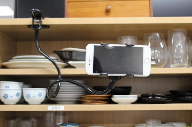 スマホ部分はしっかり固定されており、持ち運んでも落ちません。戸棚を挟めば料理のレシピを、机を挟めば動画を見ることができます。高いところに挟めば撮影にも使えそうですね。