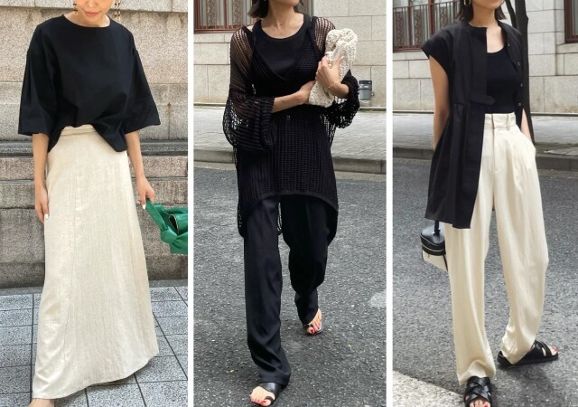 黒スキニーは春夏にはちょっと重たい印象になりそうですが、足元に旬な春色を取り入れ、さらにバッグに涼しげな素材感をプラスする事で季節感を演出していますね♪