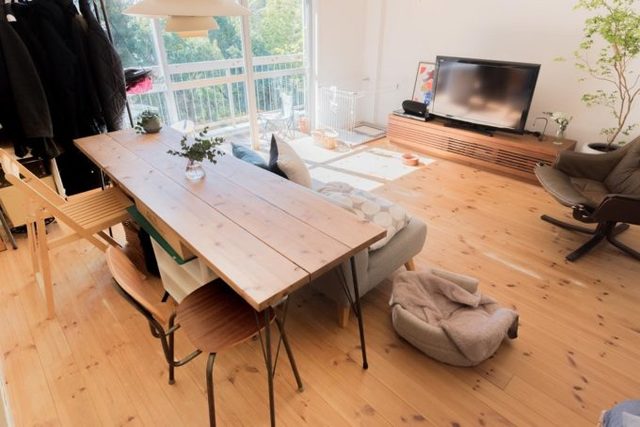 調理スペースをモノトーンで、テーブルを木製でまとめているので統一感がありますね。