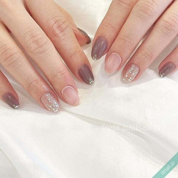 やさしいピンクベージュにシルバーのホログラムとラメを施して、クールなフレンチネイルに。ヘルシーな印象のベースとメタリックな装飾が意外にもマッチしたネイルデザインです。