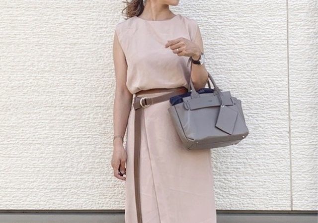 カラーはブラック、ナチュラル、ライトブルーの3色。今回は、スカートの色とあわせてナチュラルカラーを選び、全体を優しい雰囲気でまとめて好印象に。