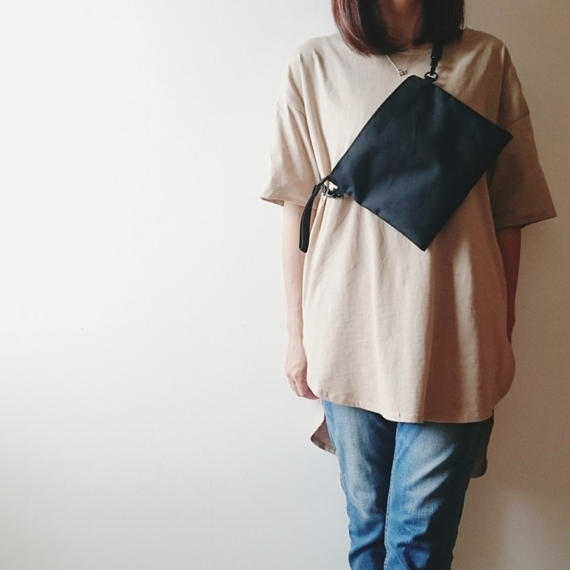 バックスタイルも、ゆったりシンプル。ヒップを隠そうとして裾を伸ばしすぎると野暮ったい印象になってしまうので、少しクシュっとたるませてあげてください。その方が断然こなれ見えします。