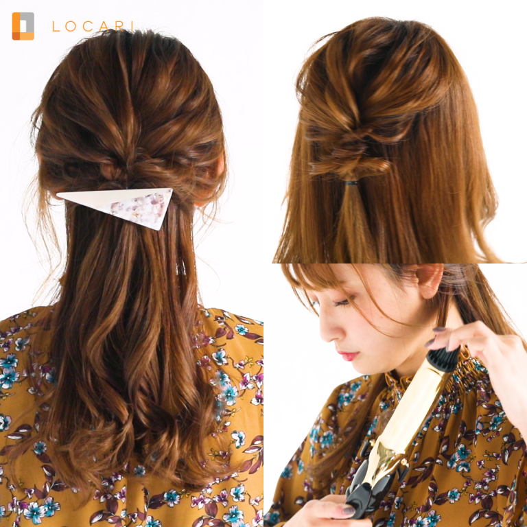 きれいな外ハネにするコツは、最初にブラッシングをしておくこと。プッシュレバーが下向きの状態で中間からアイロンを通します。毛先まで滑らせ、プッシュレバーが上に向くように回転。後ろの髪は横に引っ張ると巻きやすいですよ。
