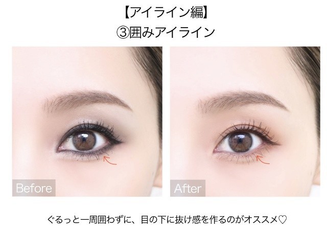 「黒で上まつ毛の隙間を埋めて密集度を高め、下まぶたの目頭に白ラインを足して白目&涙袋を強調!」