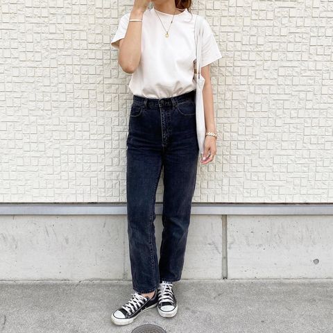 ナチュラル系を目指すなら、スラブ素材のTシャツがおすすめ。Tシャツは前はイン、後ろはアウトにすると、おしゃれに見えます。