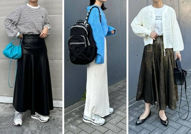 マキシスカートは思い切ってハイカットスニーカーで脚を見せないのがポイント。露出が少ない分、脚長効果も抜群です。