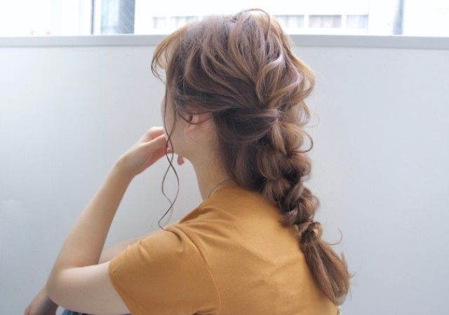 ベビーオイルを全体につけサイドの髪を残し半分三つ編みにしゴムで留めて崩します。サイドをロープ編みし崩して三つ編みに巻き込みます。コテがなくてもこなれルーズなアレンジが完成♡