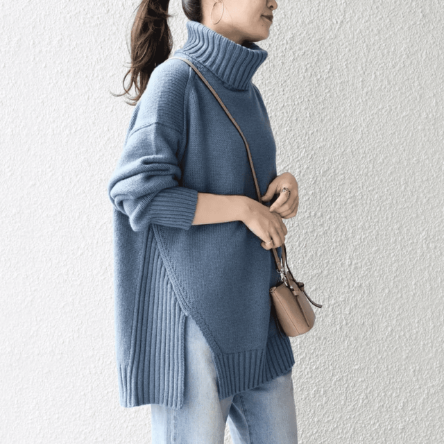 ざっくりとしたタートルニットは顔映りもよく、暖かさも抜群なので子どもの公園遊びに付き合うママのマストアイテム。
