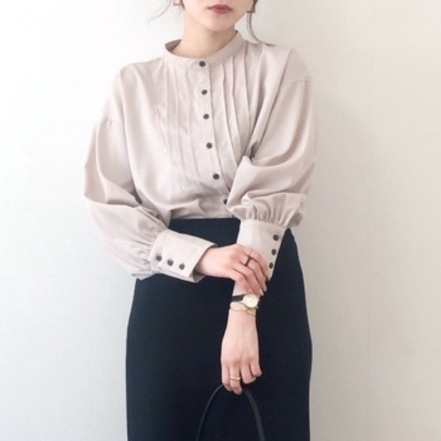 ホワイトシャツを着たいけど、シミはつけたくないという人はジャケットやカーデと合わせた着こなしを。スタンドカラーのシャツなら首が長く細く見える効果がある優秀なアイテム。