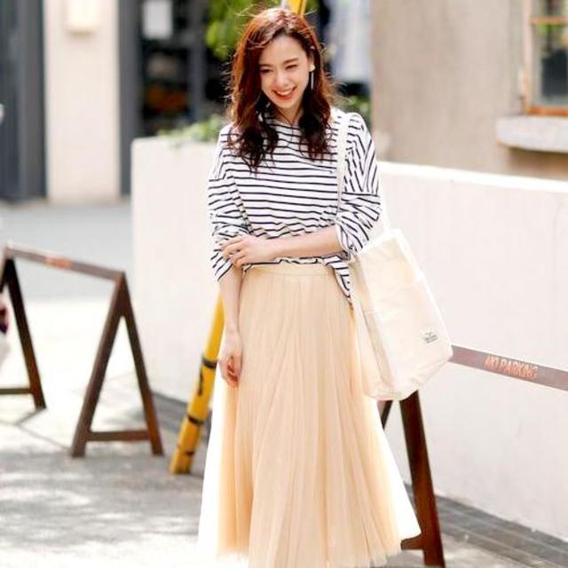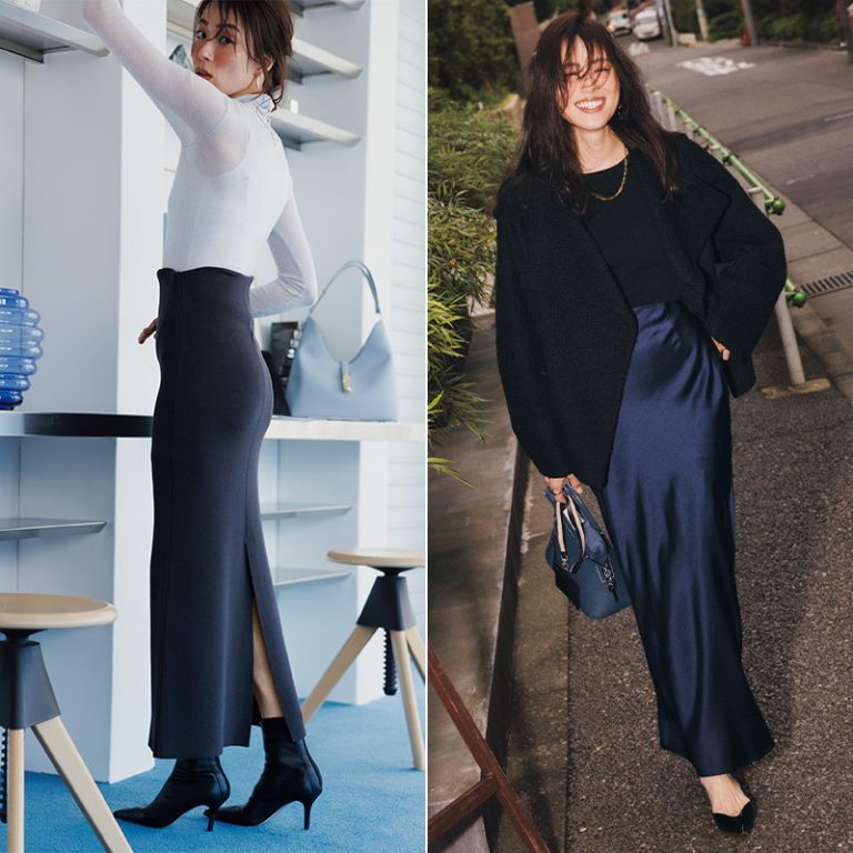 こなれ感漂う前後で長さが違う美しいシルエットのロングスカート。ぴったりとしたトップスを合わせると上半身の華奢さが強調され、脚長効果もバッチリ。