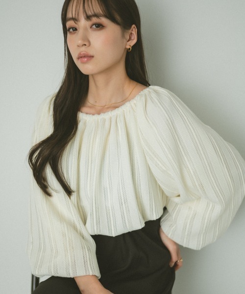 首元はデコルテがスッキリ見えるボートネック。アウターやストールと合わせても苦しい印象にならないので、オンオフ兼用がしやすいんです。幅の広いリブは存在感があり、どんな服とも相性抜群です。