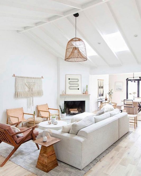 真っ白のソファが清潔感を演出し、お部屋の印象を明るくしています。お部屋のトーンと合わせたエキゾチックな柄のカーテンも素敵です♡