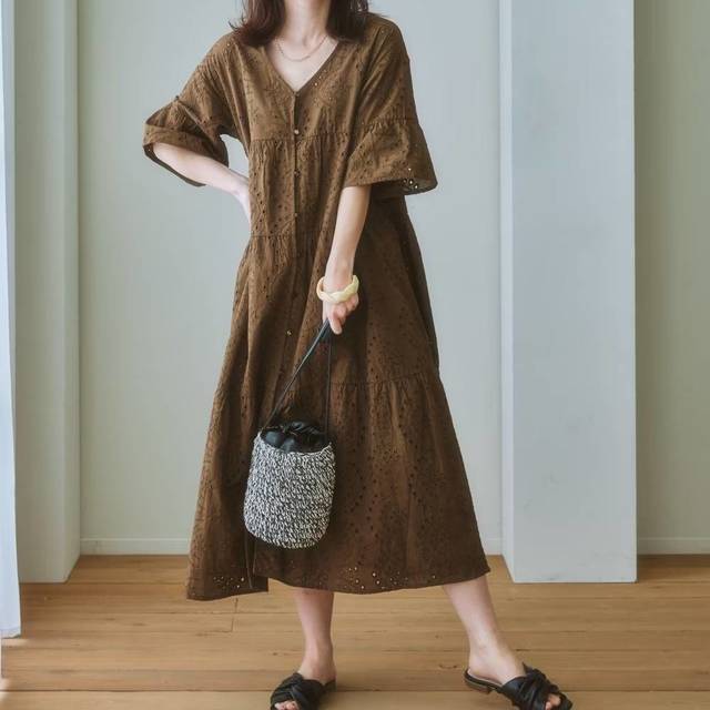 でも、肩掛けしたカーディガンや足元のさし色によって印象的な着こなしに。