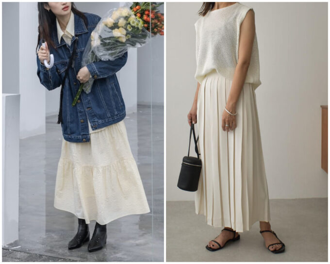 シンプルにスキニーパンツと合わせるのはもちろん、こんな風にスカートと合わせるのもおすすめ。ゆるっとしたフォルムがトレンド感抜群で、旬の着こなしを楽しめます。
