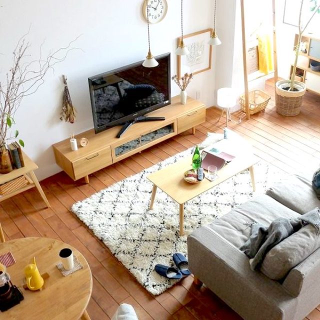 モロッカン柄のようなインパクトのあるラグを敷くと、雰囲気が良くなりますね。壁には木目柄の壁紙を貼ることで、一気におしゃれ度が上がります。