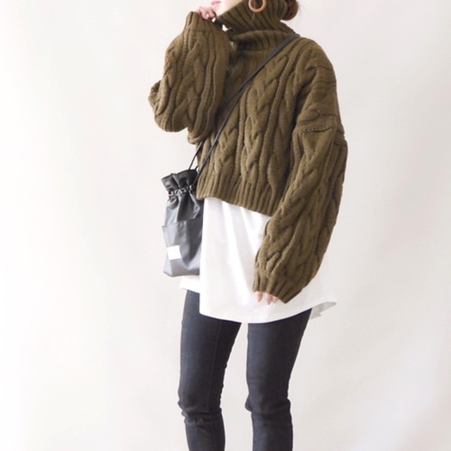 タートルネックトップスの上からストライプシャツを羽織りアウター替わりにしたコーデ。寒い冬に活躍する着こなしテクです。