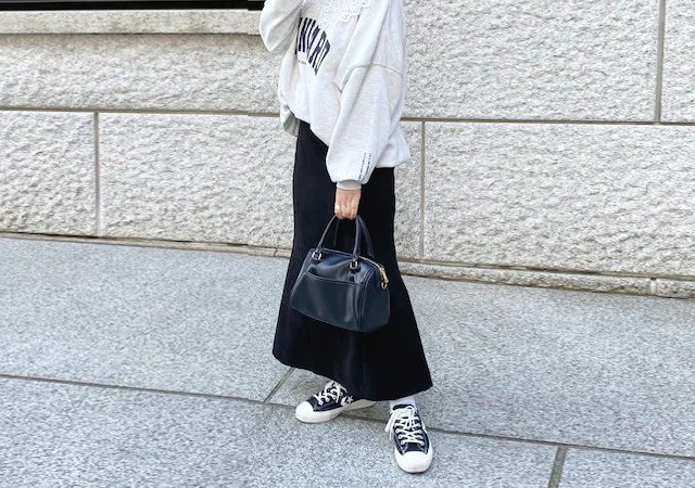 大人パステルに人気のラベンダーです。ラベンダーは、黒と合わせることでクールさが引き立つので甘くなることはありません。あえてワントーンにしてコートを主役にすることですっきり見えますね。