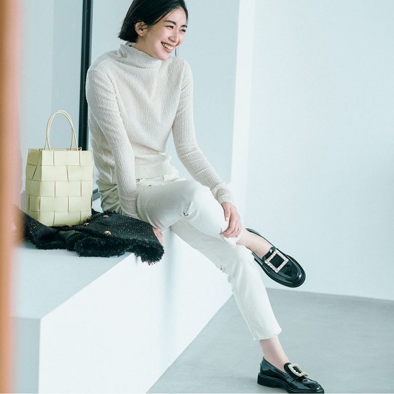 脚を出しても、嫌味のないヘルシーな雰囲気に仕上がります。モノトーンでまとめているから、大人っぽさもしっかりキープ。