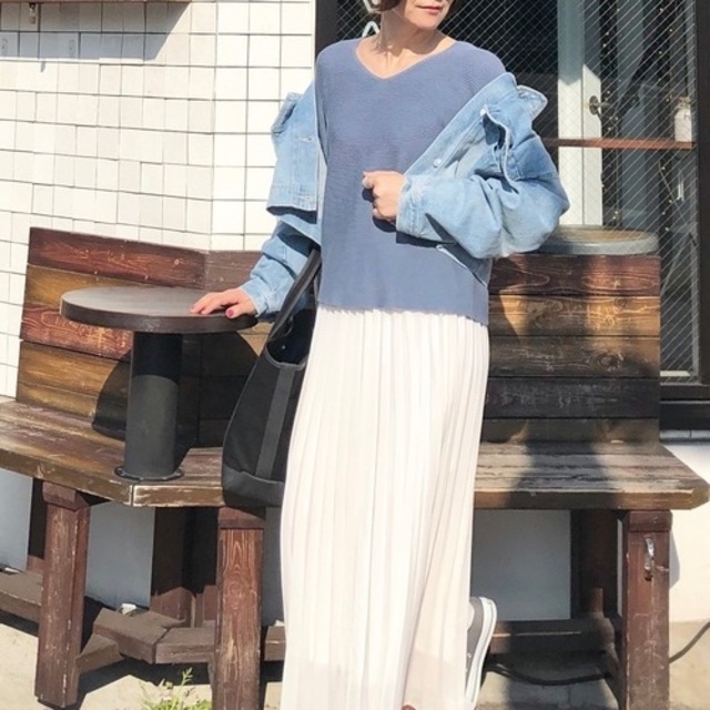 ホワイトやアイボリーなどとも相性抜群なので、淡い色でまとめて統一感あるコーデに仕上げることができました。