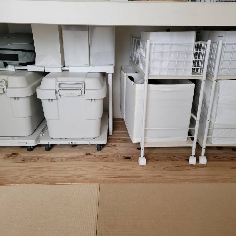 コの字型なので下の天板に物を置くことも可能。ゴミ箱や収納ボックスなどを置けて省スペースなのも◎。