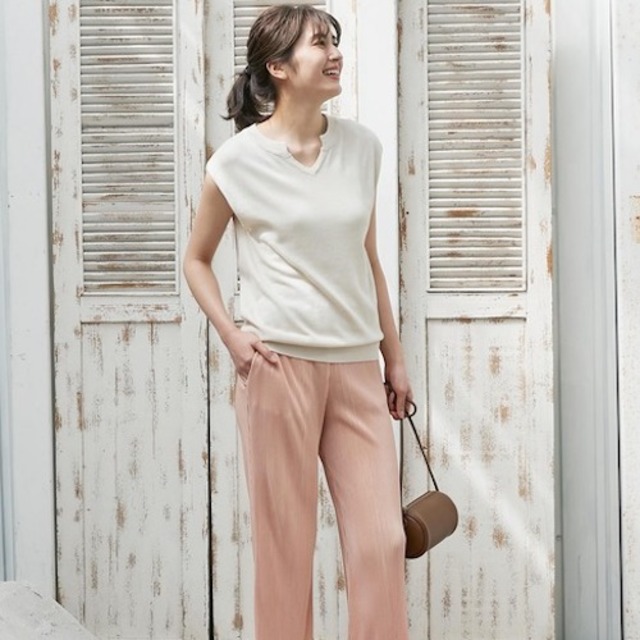ボトムに色味をプラスすると一気に春気分にシフトチェンジ。お花のカラーがイエロー・ピンク・ブルーなので、その色味に合わせてボトムを選ぶと統一感があってまとまりやすいですよ。