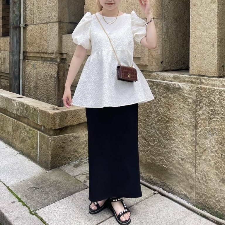 はくだけでIラインのシルエットを作ってくれるナロースカートですが、裾をアウトして合わせるときは丈感に注意したいところ。