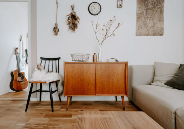 床板がはずされているリビング横の部屋。アンティーク雑貨やアーティストの作品をあしらって。