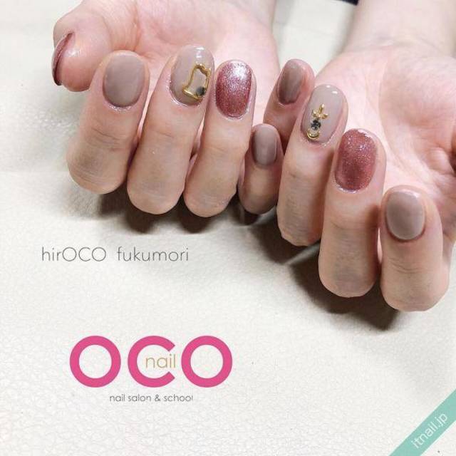 ベージュの丸フレンチにべっ甲柄の丸フレンチをアクセントで入れています。ゴールドのパーツも相まってクラス感のある仕上がりになっています。