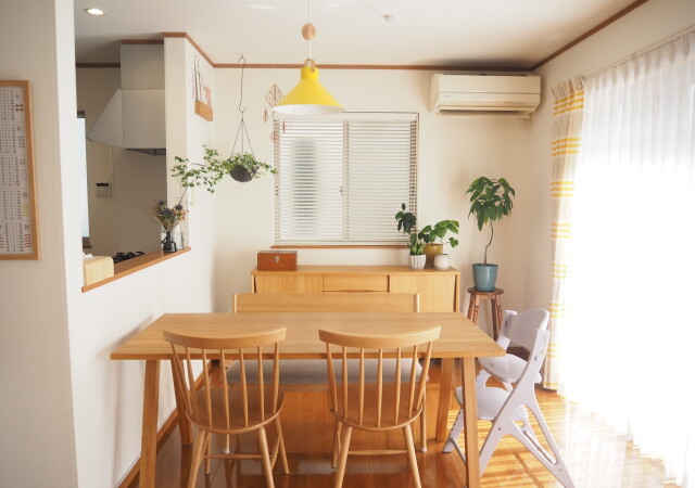 素朴な風合いのダイニングテーブルに、ポップな色使いの椅子を組み合わせた明るく爽やかなダイニングルーム。