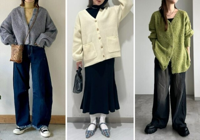カラーカーディガンで華やかさをプラスしました。