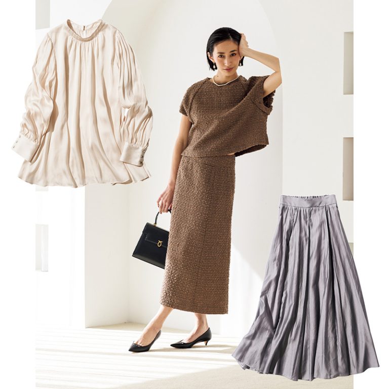 プリーツスカートのようにロング丈のトップスとレイヤードも可能。