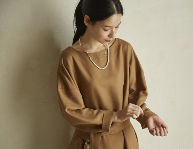 くすみがかったテラコッタのカットソーで、大人っぽく落ち着いたムードに。