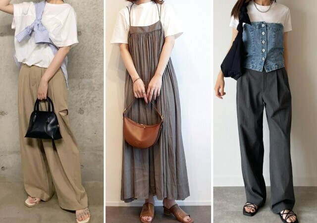 パンツはとろみ素材などキレイめな素材で、シンプルなストレートパンツ、タックパンツなどが似合います。デニムの場合はダメージが少なくてキレイめにはけるものを選びましょう。