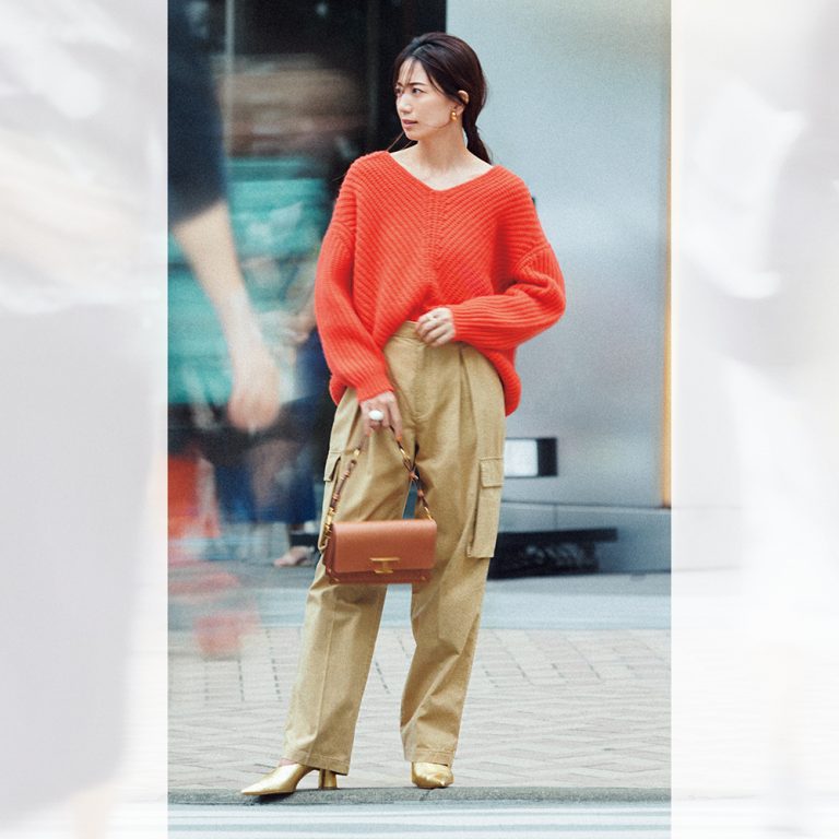 パンツに合わせるアイテムはブラウン色に馴染む色味なのでまとまり感があります。