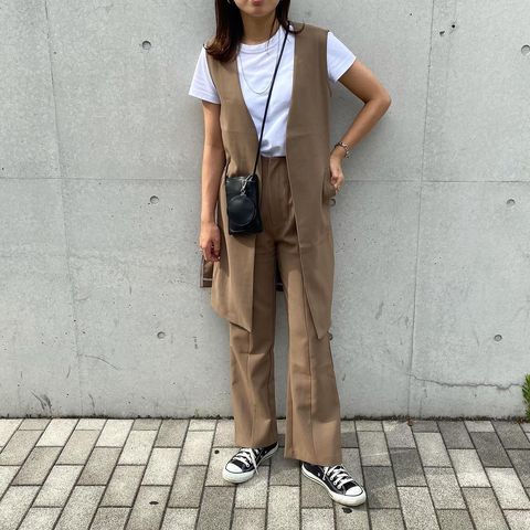 ただゆったりさせるだけだと、だらしなく見えてしまうので、ベルトでウエストマークをしたり、カラーアイテムを取り入れたりして、メリハリをつけるのがおすすめです。