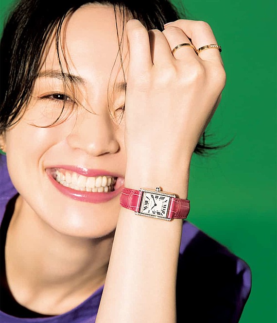 時計〝タンク ルイ カルティエ〟[ホワイトゴールド・ダイヤモンド・アリゲーターストラップ]¥1,896,000リング[人差し指]¥188,000[中指]¥101,000(すべてカルティエ/カルティエ カスタマー サービスセンター)ブラウス¥22,000(LE PHIL/LEPHIL NEWoMan 新宿店)