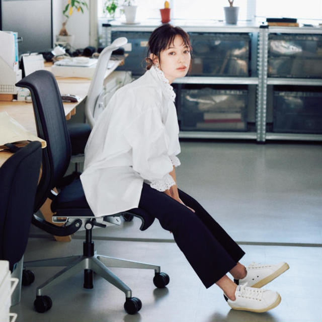 1カ所だけ甘いブラウス×スニーカーで知的美人に[スニーカーに最高に似合う服]