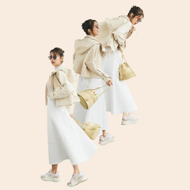 [2023春の通勤スニーカーはなじませカラーで]ハイテクスニーカー×スカートでつくる好バランス2コーデ