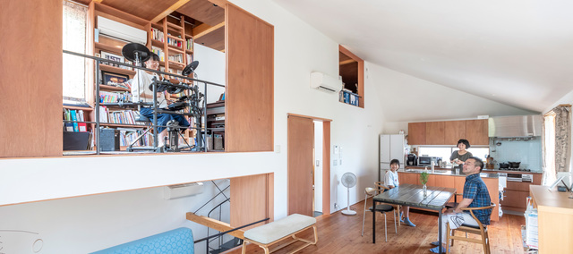 外にも中にも視線が抜けるおおらかなつくりで人が集まる家