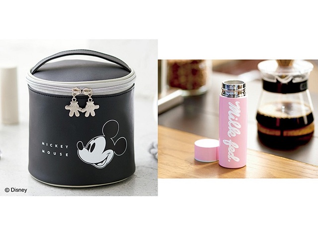 ミッキーマウスのイラスト入りポーチは通常号の付録で! ミルクフェドのプチステンレスボトルは増刊号で手に入れて♪